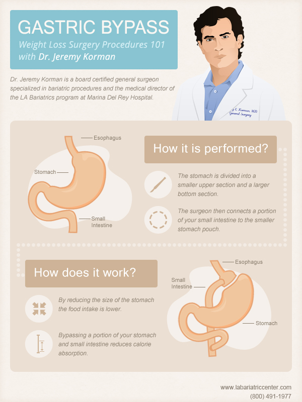 Dr. Korman, the medical director and bariatric surgeon, performs a wide range of surgical weight loss procedures at Cedars-Sinai Marina del Rey Hospital's weight loss program, Marina Weight Loss. With the following infographic you can learn the steps of a gastric bypass procedure performed by Dr. Korman at our Bariatric Surgery Center of Excellence.